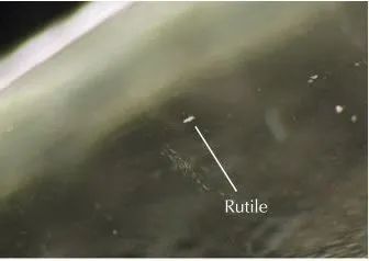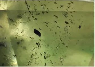 缅甸 Pyaung-Gaung橄榄石内部特征主要由圆形衰变晕(“睡莲叶”状包裹体)、流体包裹体和纤维簇组成。其中固态包裹体有金红石、铬铁矿、菱镁矿、绿泥石、蛇纹石、滑石等晶体。